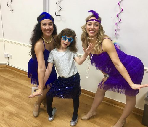Two female dancers in flapper costumes, and the birthday girl posing in star glasses